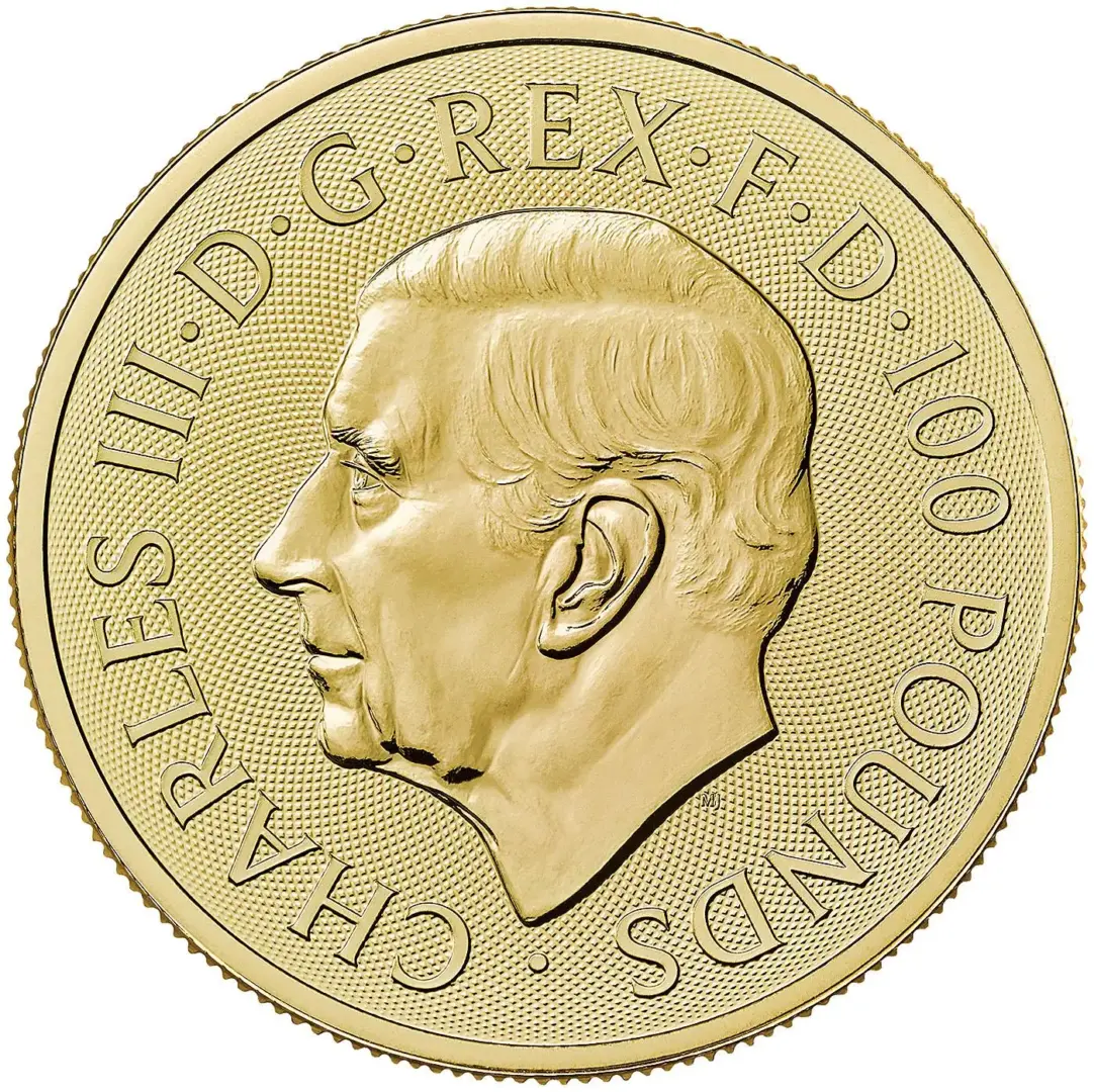 The obverse features the official King Charles III portrait by Martin Jennings, accompanied by the legend ‘CHARLES III·D·G·REX·F·D·100 POUNDS’.