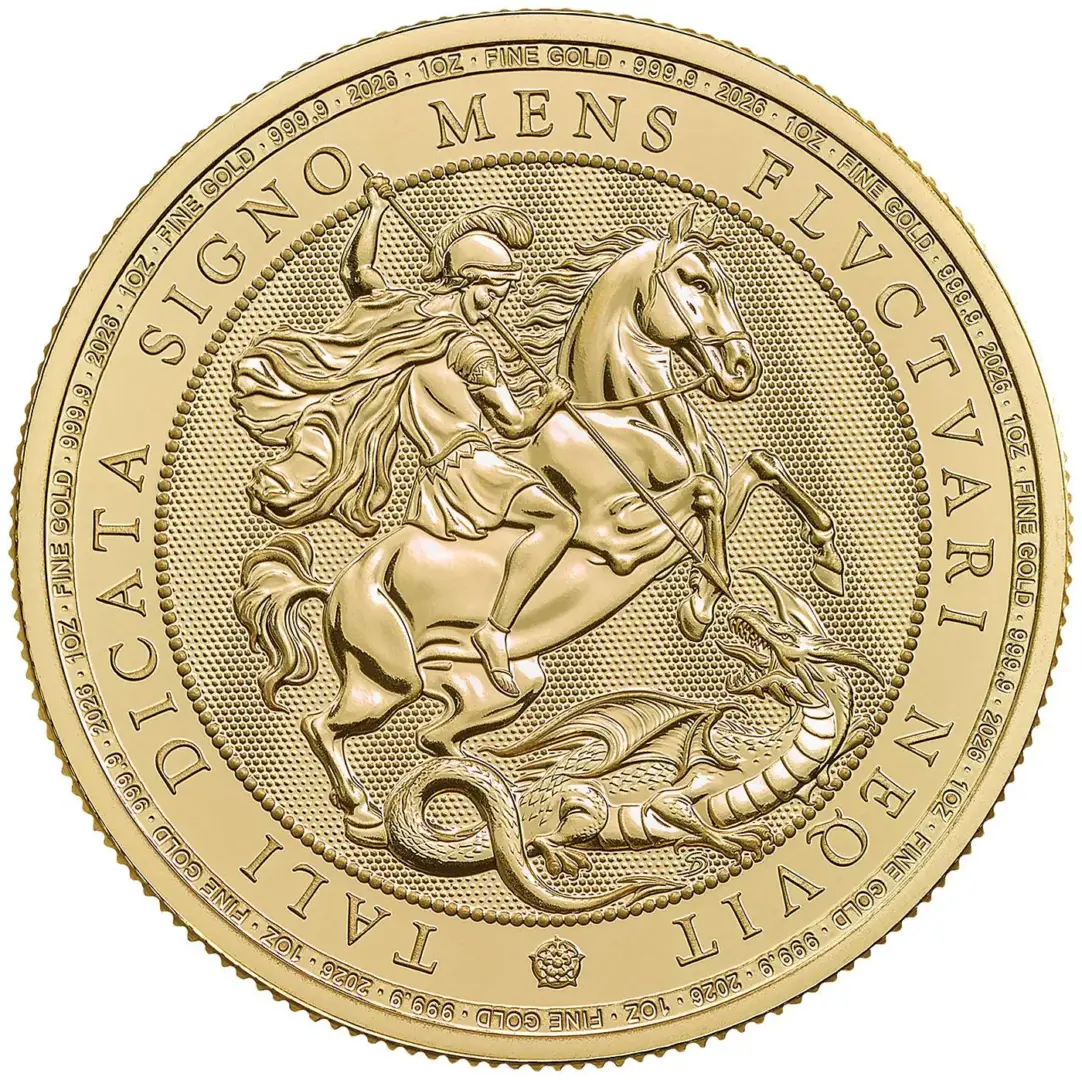 The 2026 1oz St George and the Dragon coin is a British gold coin, minted by The Royal Mint. The weight of the coin is 31.21 grams with a fineness of 999.9 (24 carat gold), meaning it contains 31.1035 grams of pure gold. The diameter of the coin is 32.69mm. The coin has a face value of 100 Pounds and is legal tender in the UK.